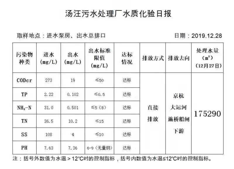 汤汪污水处理厂水质化验日报(2019.12.28)