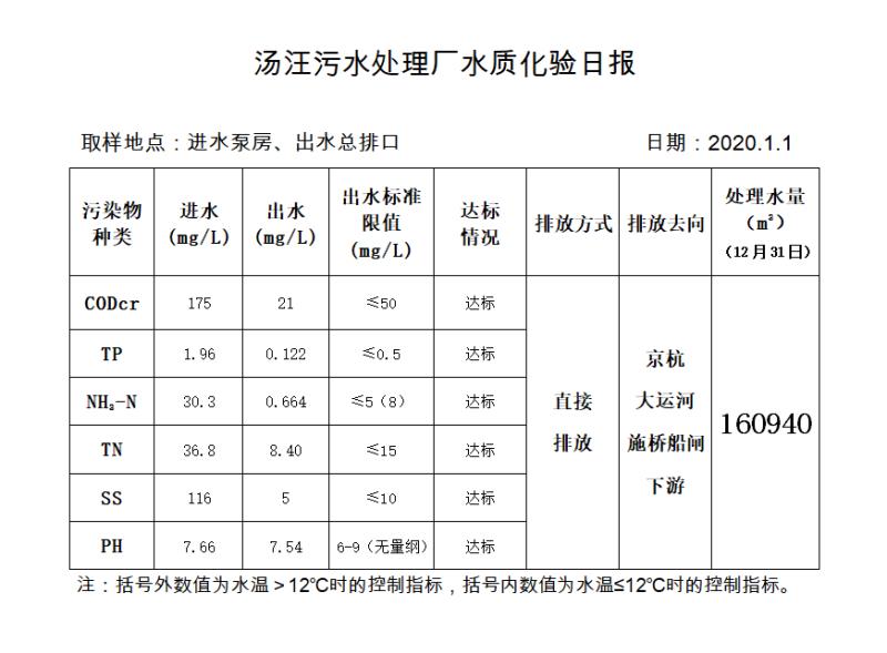 汤汪污水处理厂水质化验日报(2020.1.1)