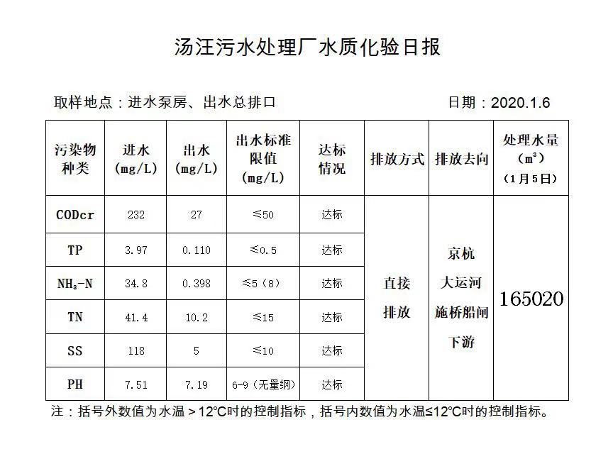 汤汪污水处理厂水质化验日报(2020.1.6)