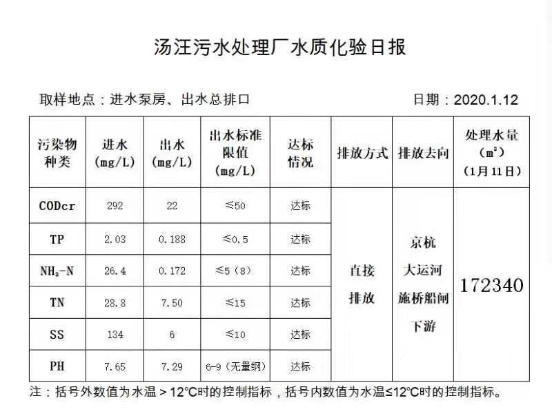 汤汪污水处理厂水质化验日报(2020.1.12)