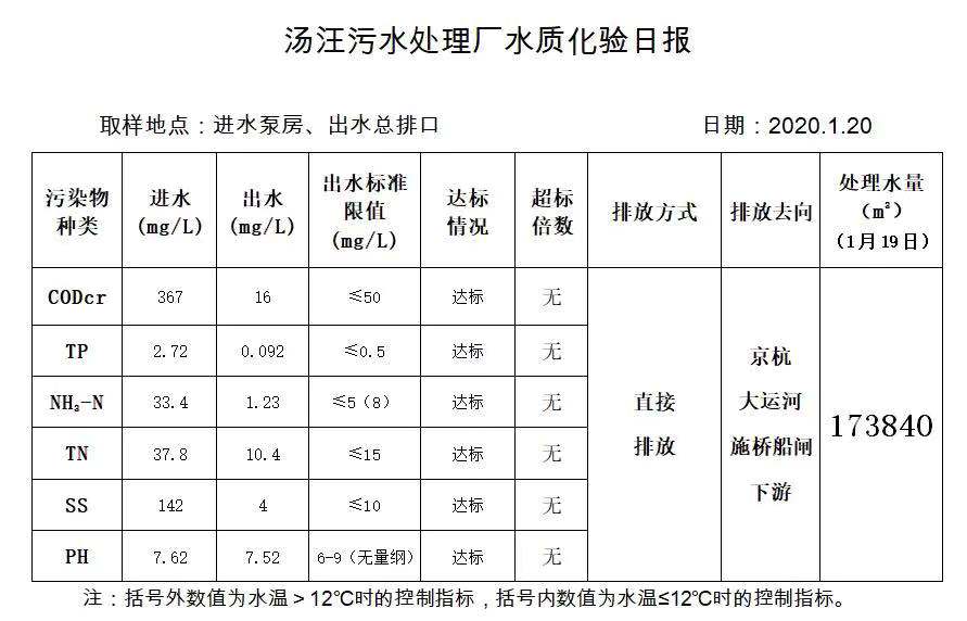 汤汪污水处理厂水质化验日报(2020.1.20)