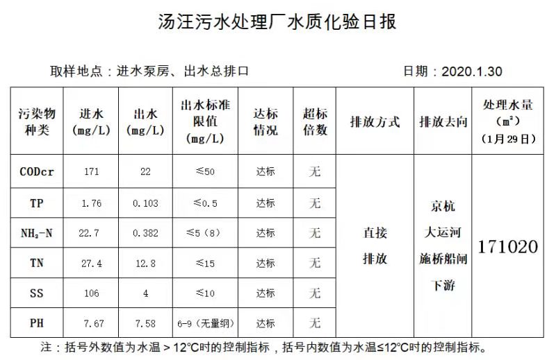 汤汪污水处理厂水质化验日报(2020.1.30)