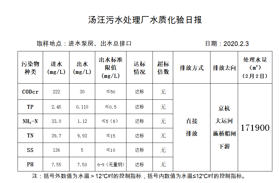 汤汪污水处理厂水质化验日报(2020.2.3)
