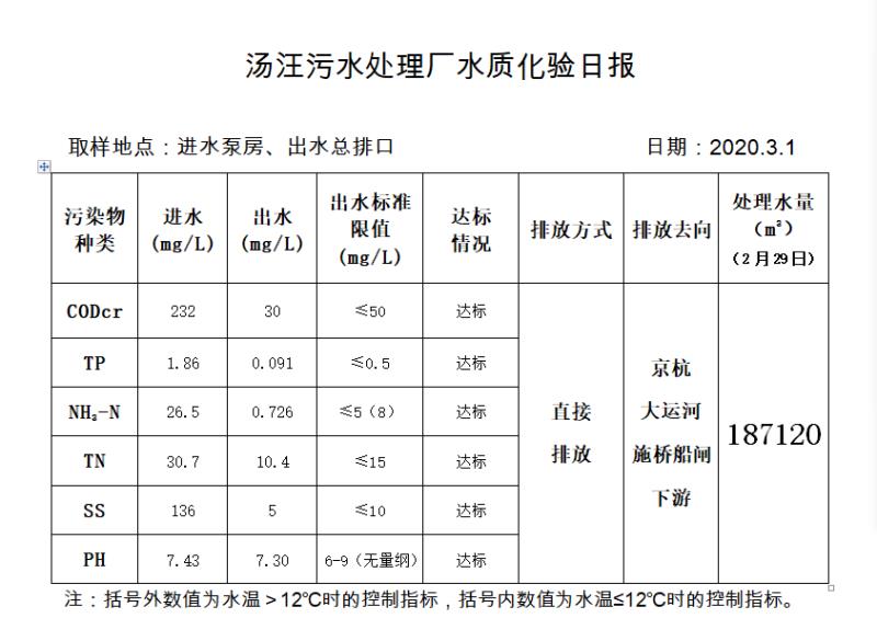 汤汪污水处理厂水质化验日报(2020.3.1)