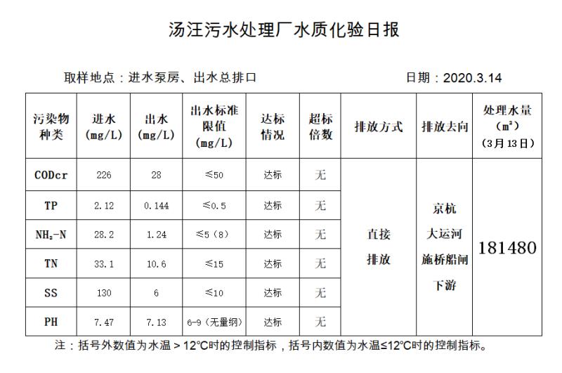 汤汪污水处理厂水质化验日报(2020.3.14)