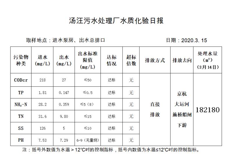 汤汪污水处理厂水质化验日报(2020.3.15)