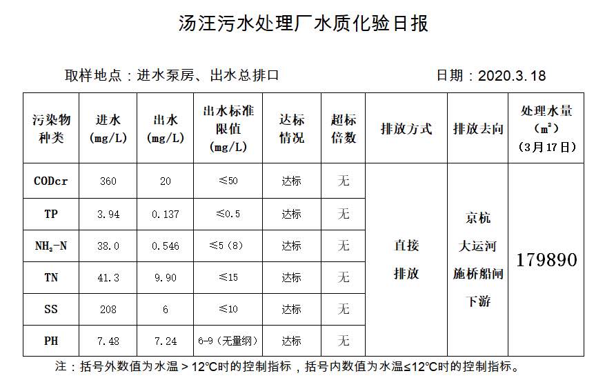 汤汪污水处理厂水质化验日报(2020.3.18)