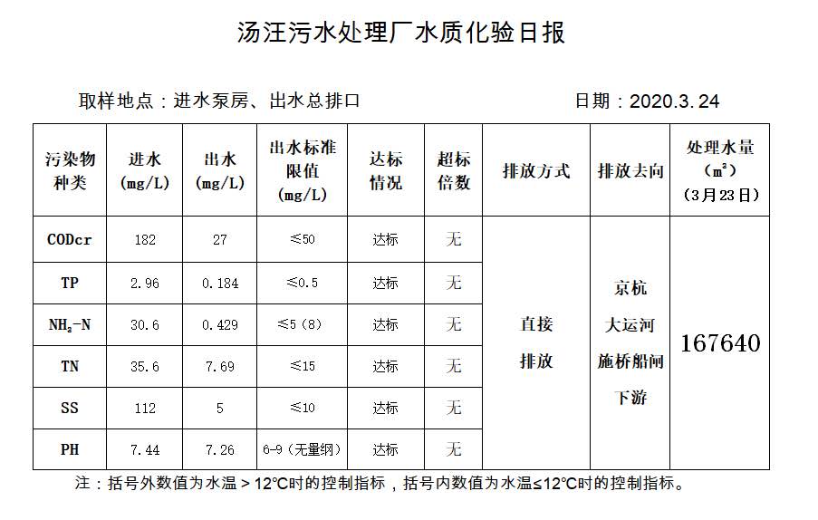 汤汪污水处理厂水质化验日报(2020.3.24)