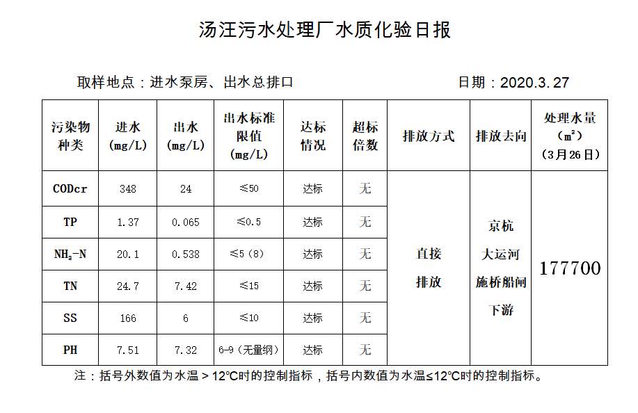 汤汪污水处理厂水质化验日报(2020.3.27)