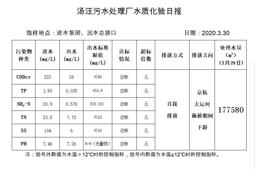 汤汪污水处理厂水质化验日报(2020.3.30)
