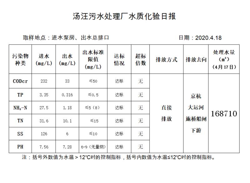 汤汪污水处理厂水质化验日报(2020.4.18)