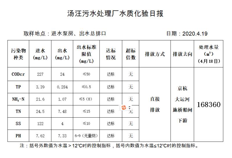 汤汪污水处理厂水质化验日报(2020.4.19)