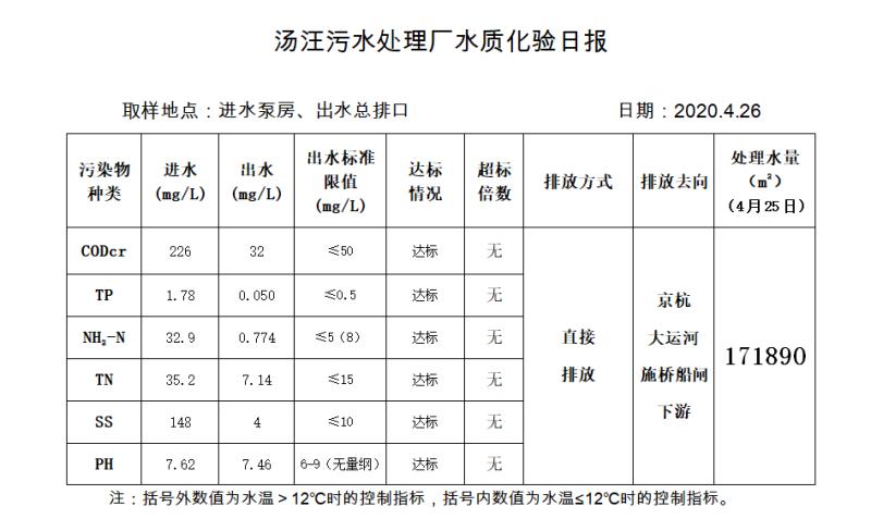 汤汪污水处理厂水质化验日报(2020.4.26)