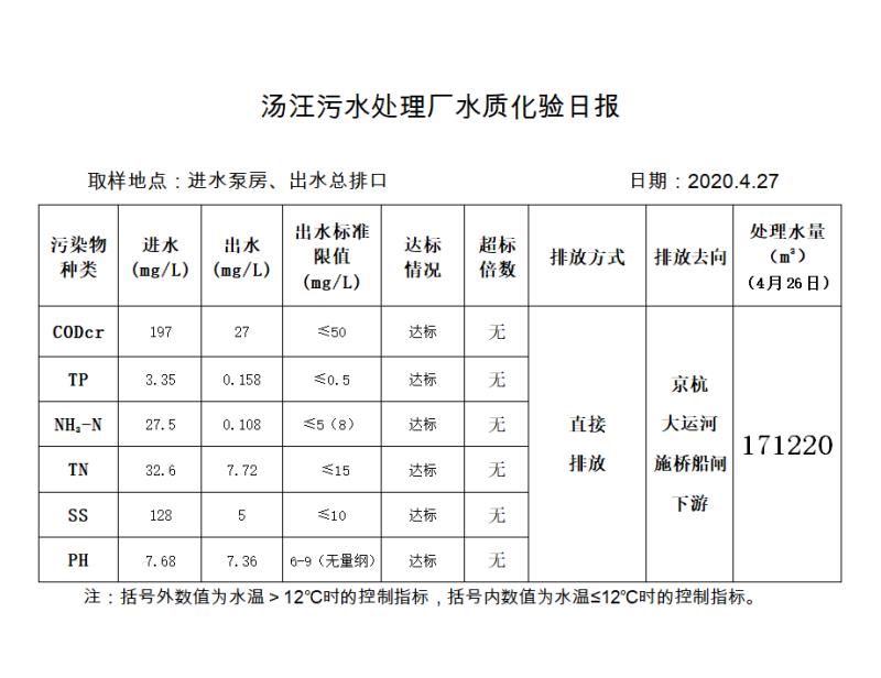 汤汪污水处理厂水质化验日报(2020.4.27)