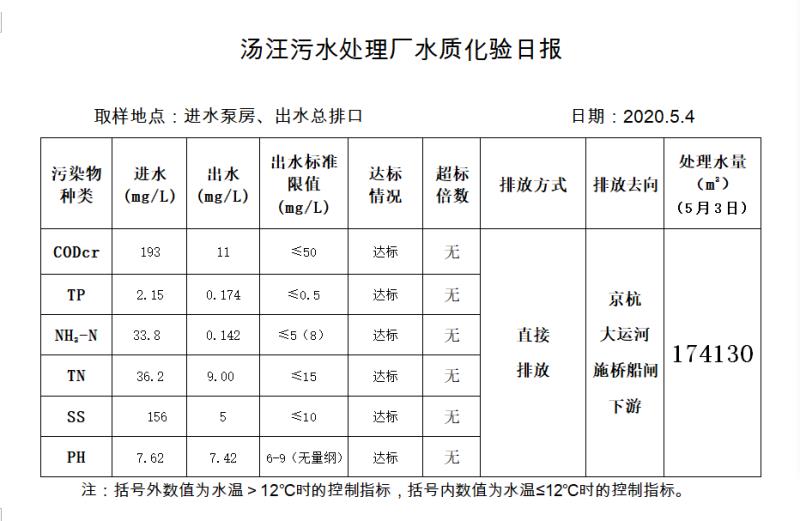 汤汪污水处理厂水质化验日报(2020.5.4)