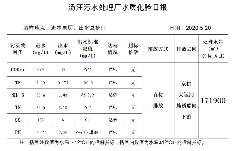 汤汪污水处理厂水质化验日报(2020.5.20)