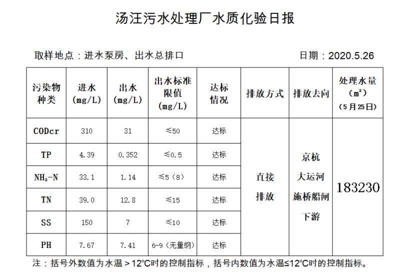 汤汪污水处理厂水质化验日报(2020.5.26)