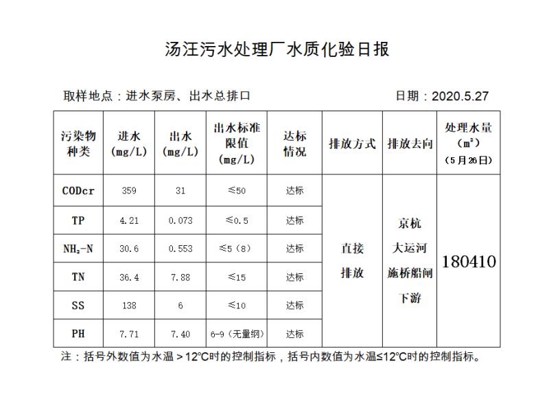 汤汪污水处理厂水质化验日报(2020.5.27)