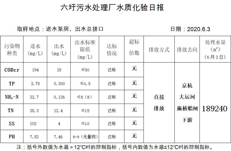 六圩污水处理厂水质化验日报(2020.6.3)