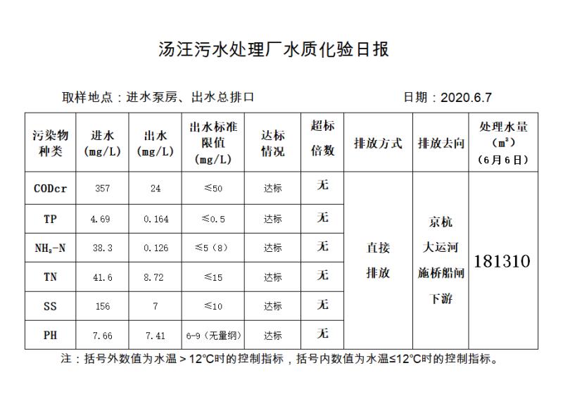 汤汪污水处理厂水质化验日报(2020.6.7)