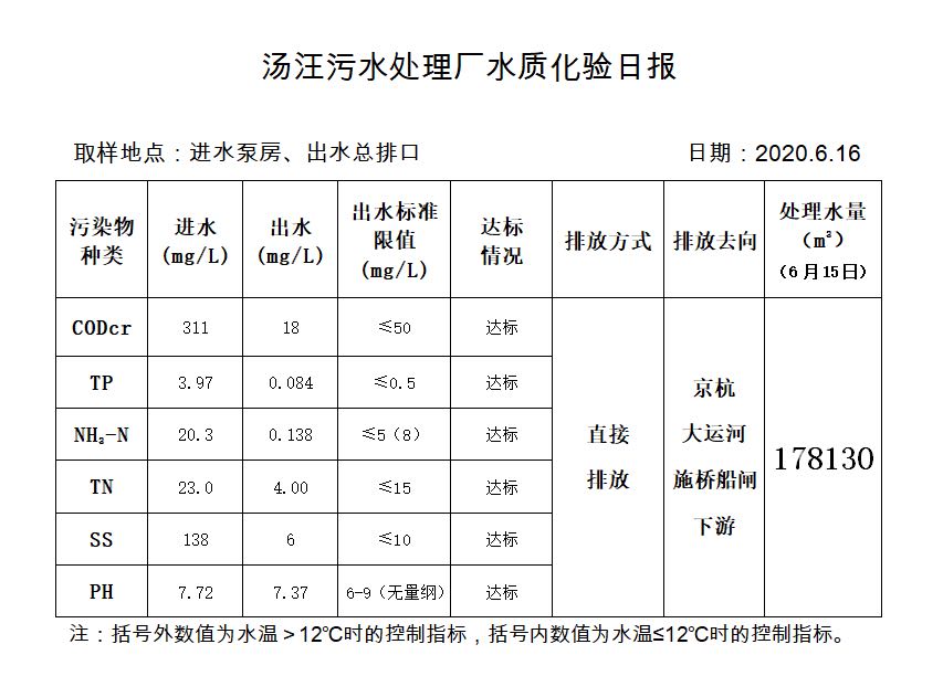 汤汪污水处理厂水质化验日报(2020.6.16)
