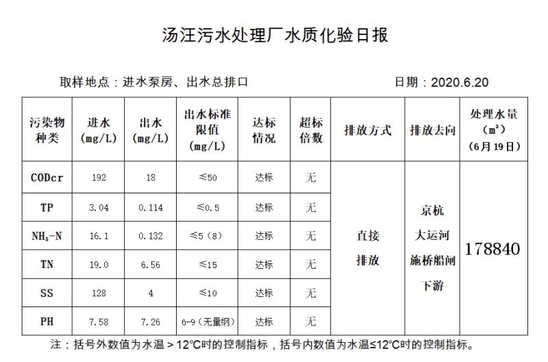汤汪污水处理厂水质化验日报(2020.6.20)
