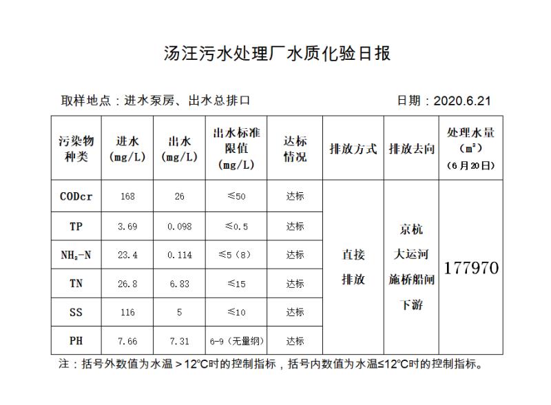 汤汪污水处理厂水质化验日报(2020.6.21)