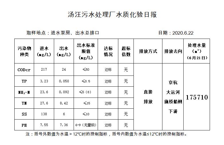 汤汪污水处理厂水质化验日报(2020.6.22)