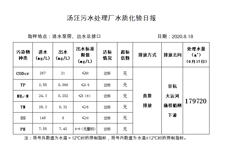汤汪污水处理厂水质化验日报(2020.8.18)