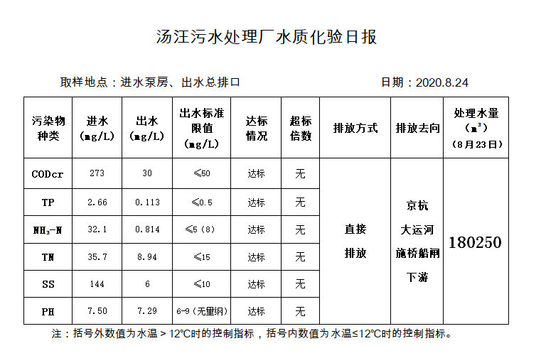 汤汪污水处理厂水质化验日报(2020.8.24)