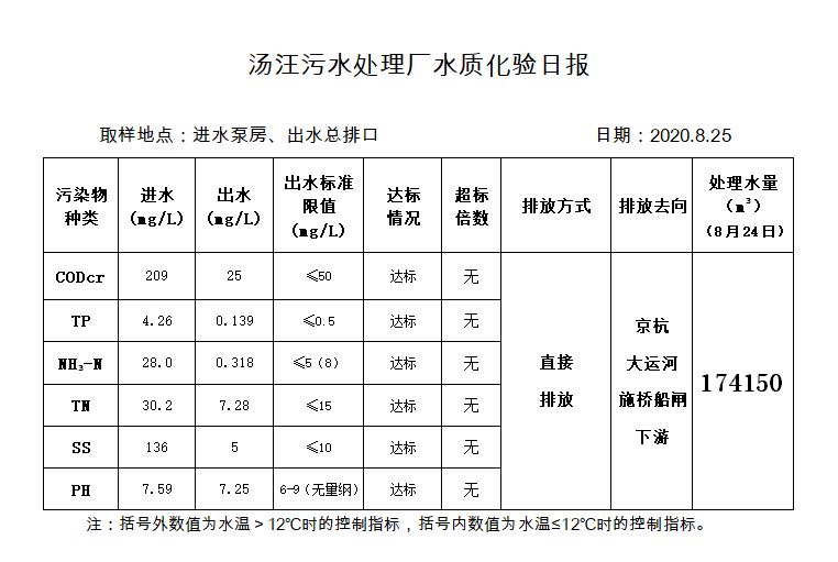 汤汪污水处理厂水质化验日报(2020.8.25)