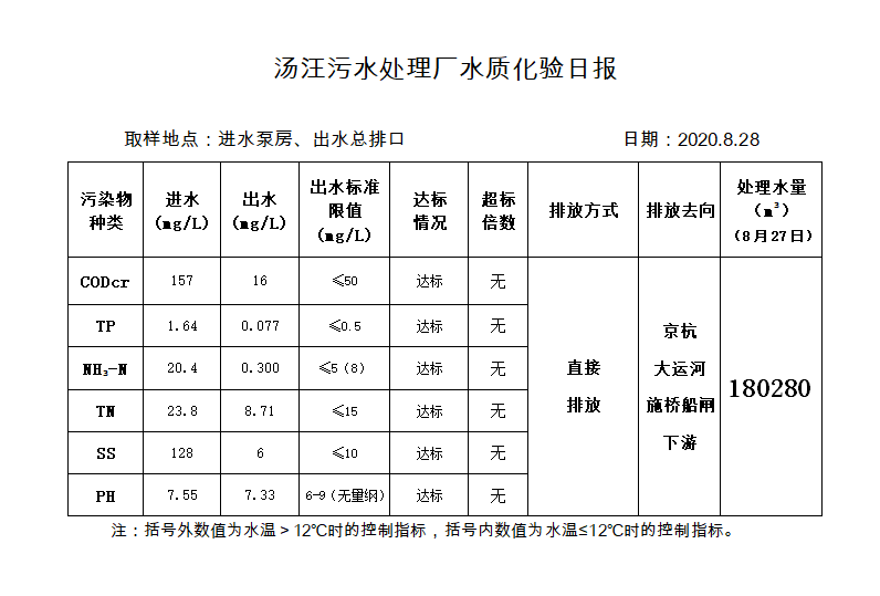 汤汪污水处理厂水质化验日报(2020.8.28)