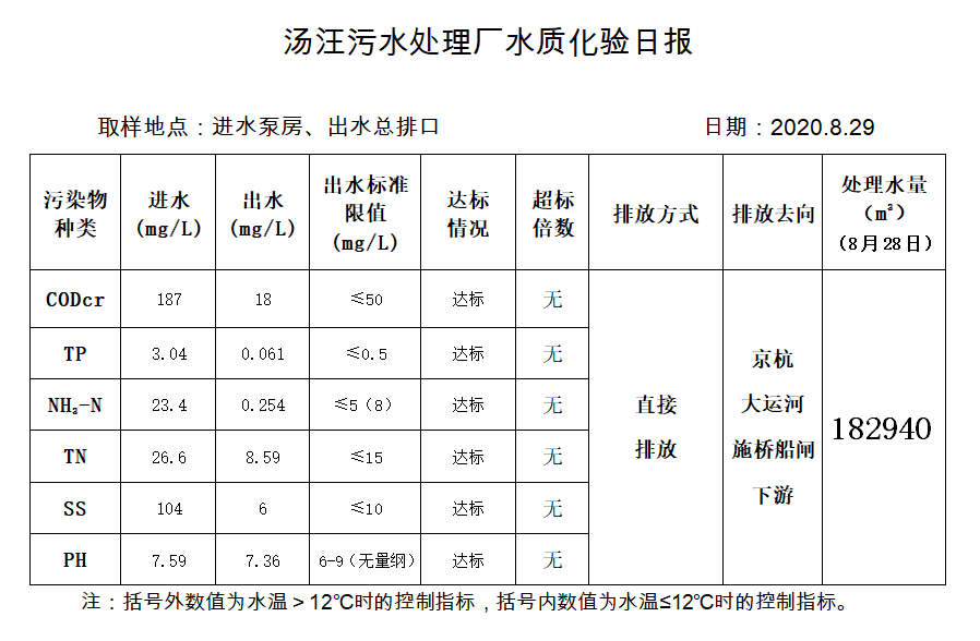 汤汪污水处理厂水质化验日报(2020.8.29)