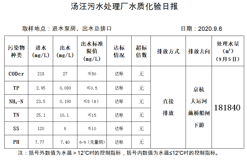 汤汪污水处理厂水质化验日报(2020.9.6)