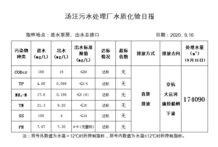 汤汪污水处理厂水质化验日报(2020.9.16)
