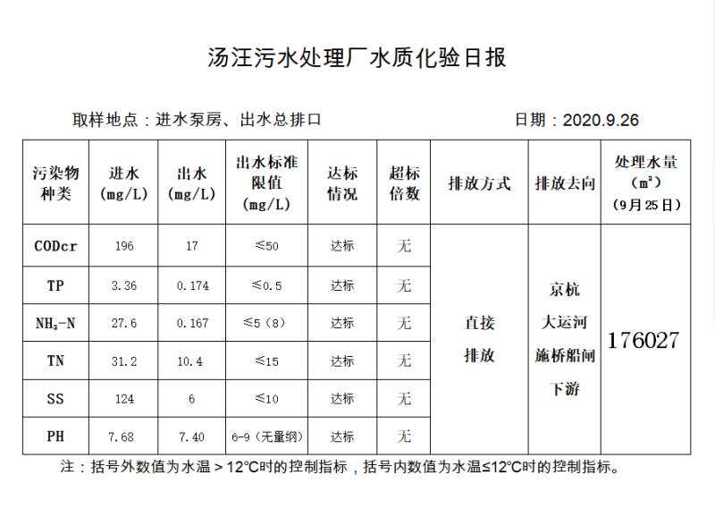 汤汪污水处理厂水质化验日报(2020.9.26)