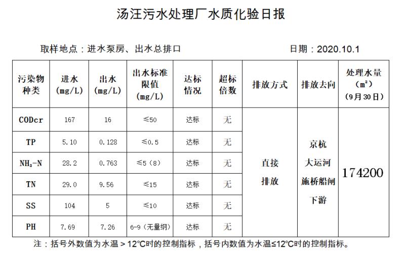 汤汪污水处理厂水质化验日报(2020.10.1)