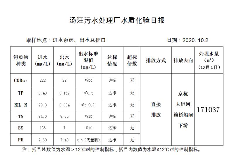 汤汪污水处理厂水质化验日报(2020.10.2)