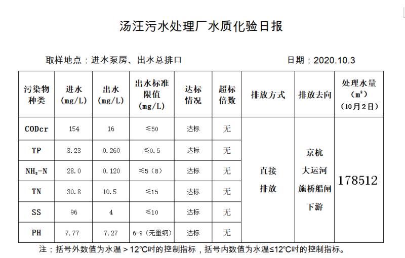 汤汪污水处理厂水质化验日报(2020.10.3)