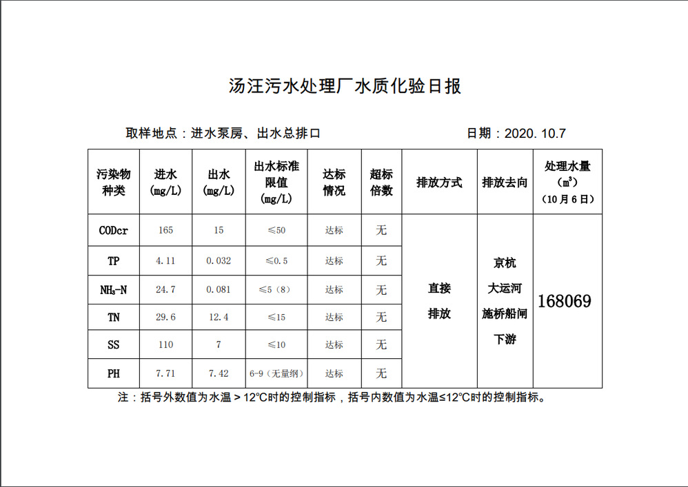 汤汪污水处理厂水质化验日报(2020.10.7)