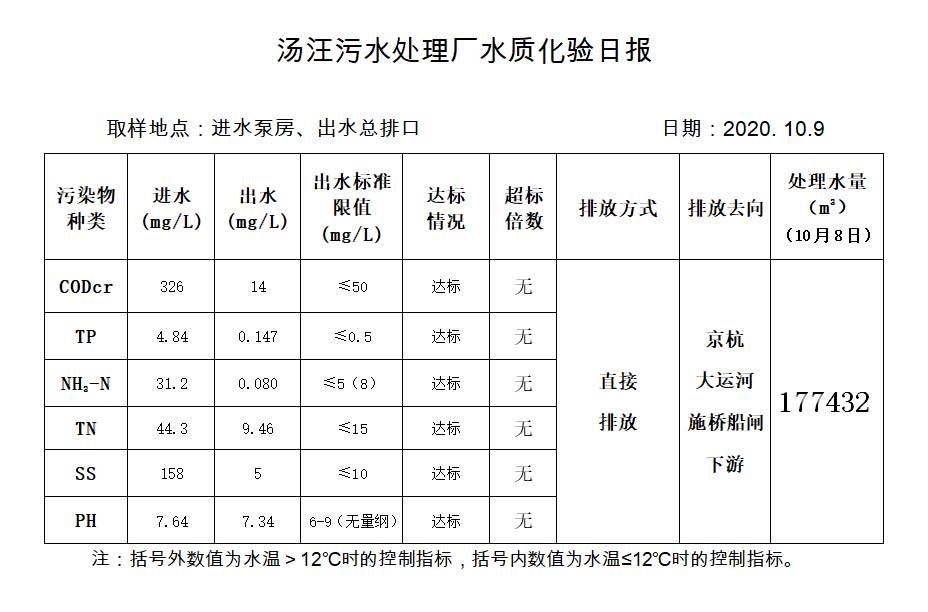 汤汪污水处理厂水质化验日报(2020.10.9)