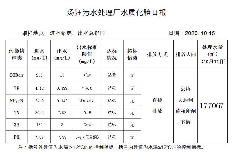 汤汪污水处理厂水质化验日报(2020.10.15)