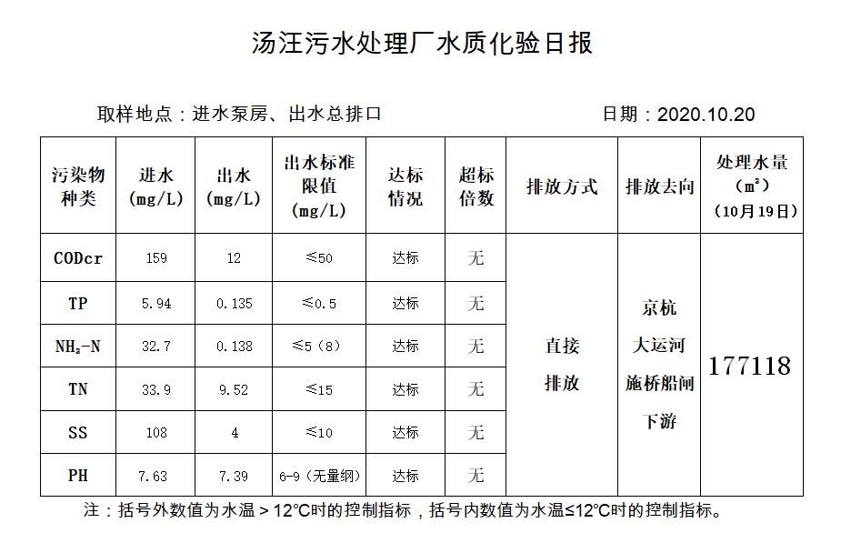 汤汪污水处理厂水质化验日报(2020.10.20)