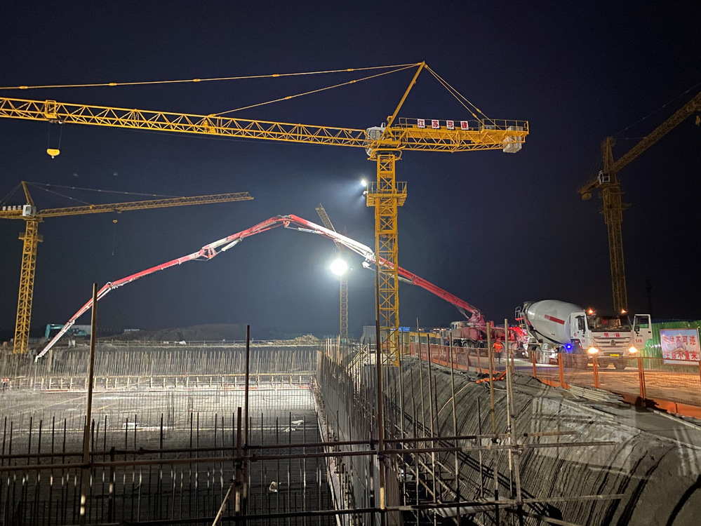 本次浇筑底板的AAO生化池池体规模大,浇筑难度系数高。为确保浇筑工作顺利进行,浇筑前参建各方多次召开施工专题会议。针对此次混凝土的浇筑方法、浇筑注意事项、混凝土强度及配合比要求等编制了详细的施工方案,并对施工过程中可能出现的问题制定了应急预案。浇筑期间,管理人员实行“两班倒”,全程监督旁站,严控浇筑质量。最终,全体人员克服了场地受限、夜间施工道路湿滑等重重困难,保安全优质量,AAO生化池一号片区混凝土底板浇筑工作按既定工期顺利完成。