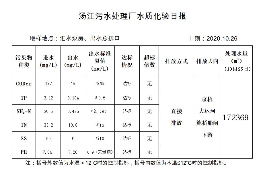 汤汪污水处理厂水质化验日报(2020.10.26)