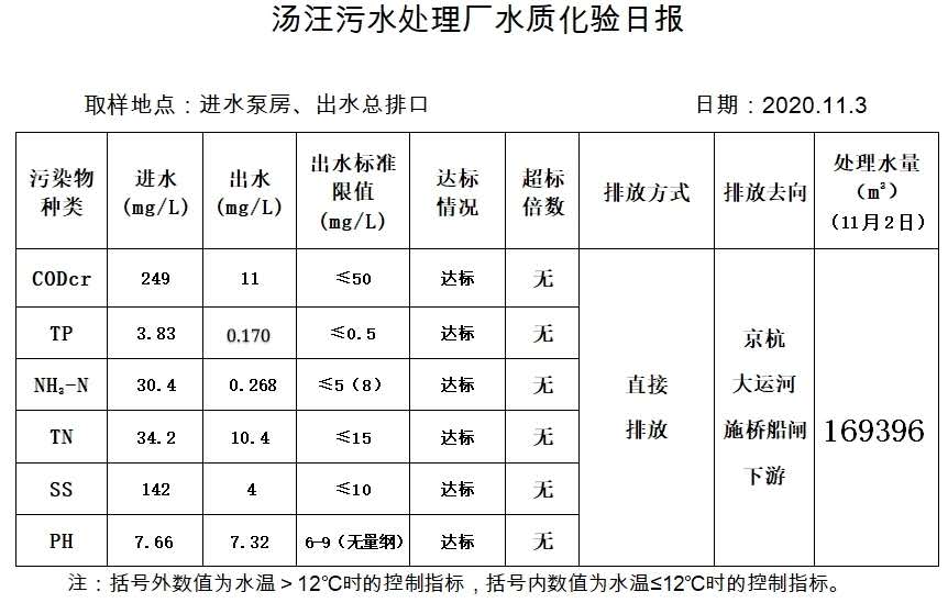 汤汪污水处理厂水质化验日报(2020.11.3)
