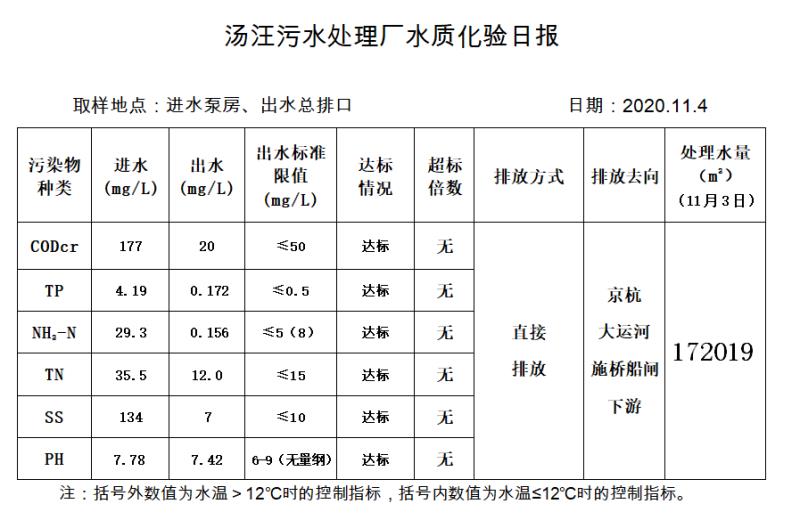 汤汪污水处理厂水质化验日报(2020.11.4)