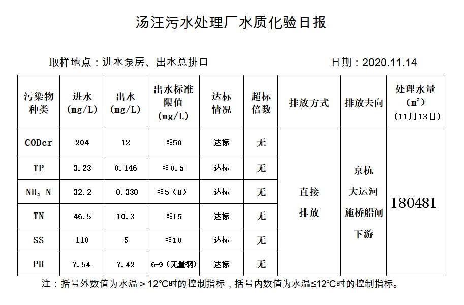 汤汪污水处理厂水质化验日报(2020.11.14)