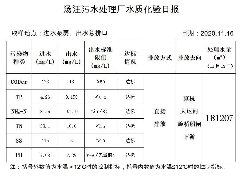 汤汪污水处理厂水质化验日报(2020.11.16)