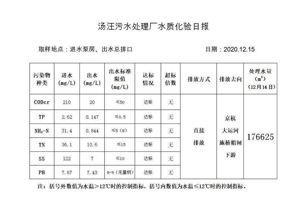 汤汪污水处理厂水质化验日报(2020.12.15)